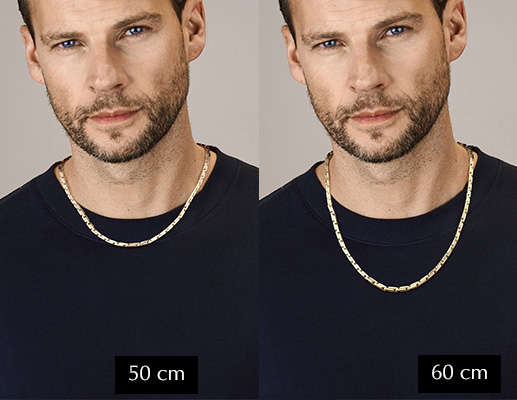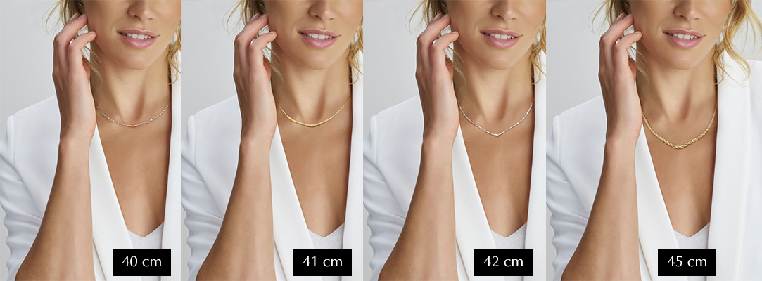 Kettingen of colliers zijn er in verschillende lengtes. Afhankelijk van smaak en breedte van de hals kies je de juiste lengte: